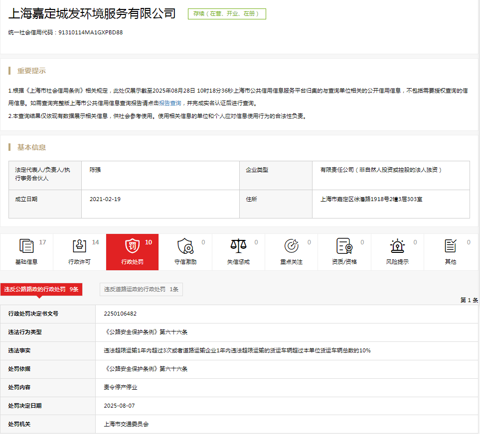 近日,信用上海公示了上海嘉定城发环境服务有限公司的行政处罚决定。2250106482行政处罚决定书文号显示,上海嘉定城发环境服务有限公司的违法事实为违法超限运输1年内超过3次或者道路运输企业1年内违法超限运输的货运车辆超过本单位货运车辆总数的10%。依据《公路安全保护条例》第六十六条,上海市交通委员会对其作出责令停产停业的处罚。